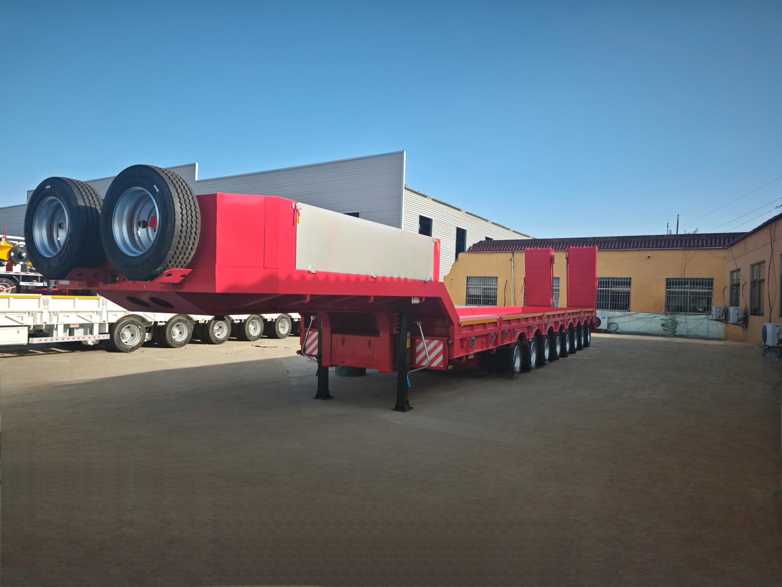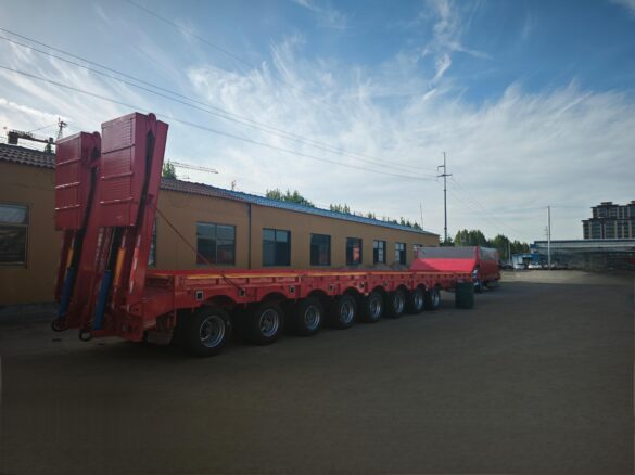 The platform height is usually 0.8 ~ 1.2 meters, which lowers the center of gravity, improves stability, and adapts to height-limited road sections. The standard load capacity is 30 ~ 100 tons, and the heavy-duty model can reach more than 200 tons; Made of high-strength steel or alloy material, the frame has strong torsion resistance. A variety of structural designs, optional hydraulic lift, remote control steering, electronic braking system (EBS), or ladders, binding points and other accessories.