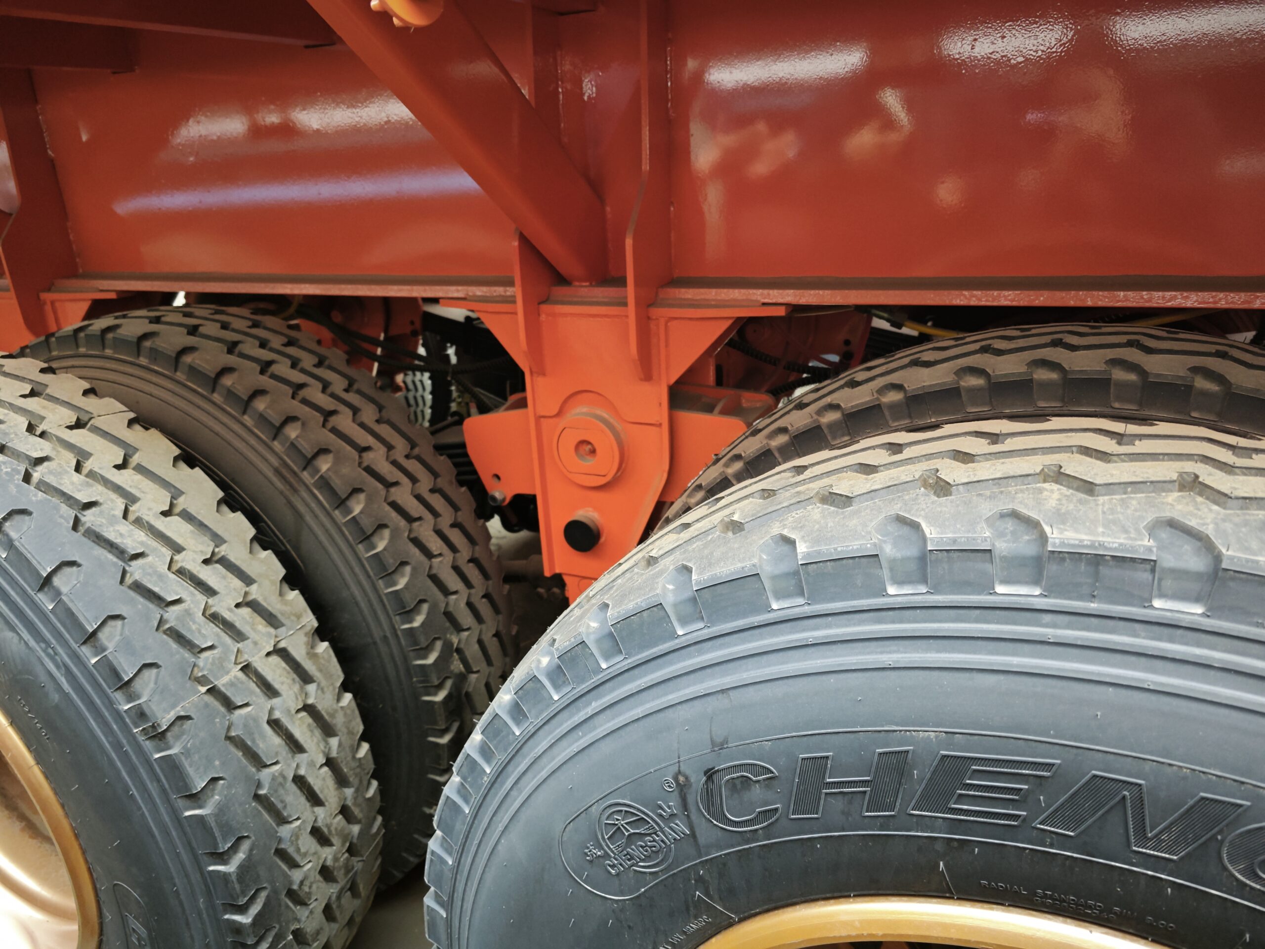 3 13-ton widened axles (without ABS), with 10 13mm thick leaf springs and 60# mechanical suspension, provide excellent load-bearing capacity (total load of about 39 tons) and anti-bumping performance, adapting to complex road conditions. 450-500mm high-strength steel beam (14×8×16mm) with 10# channel steel through beam, with 16# channel steel side beam, the overall structure has high rigidity and strong torsion resistance, ensuring no deformation under heavy load. 4 double 2 single air chamber configuration, with Ruili relay valve, fast braking response, good heat dissipation, and safer long downhill conditions. 12 triangular 12R22.5 vacuum tires (with 14-layer standard steel rims), strong grip, wear resistance and reduce the risk of tire blowout. With high load-bearing and strong structure as the core, this semi-trailer takes into account safety and practicality, and is suitable for efficient heavy-load transportation needs, but it should be noted that there are no ABS system braking restrictions on slippery roads. It is recommended to select auxiliary safety devices according to actual working conditions.