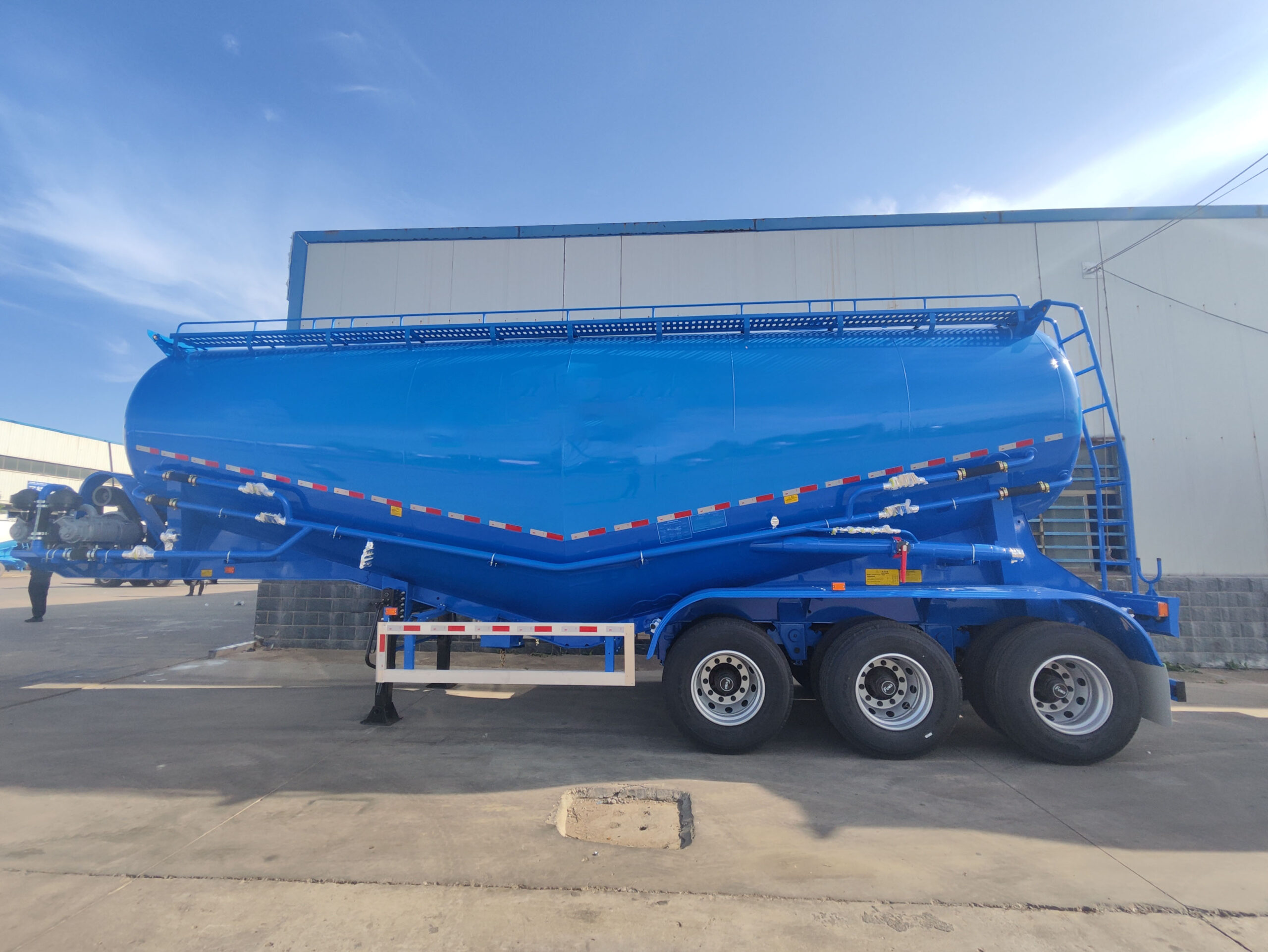 Powder tank semi-trailer is a special vehicle specially used to transport dry powder materials such as bulk cement, fly ash, and mineral powder. It adopts a closed pressure conveying design and has the characteristics of high efficiency, environmental protection, and low loss. It is widely used in construction, building materials, electric power and other industries.